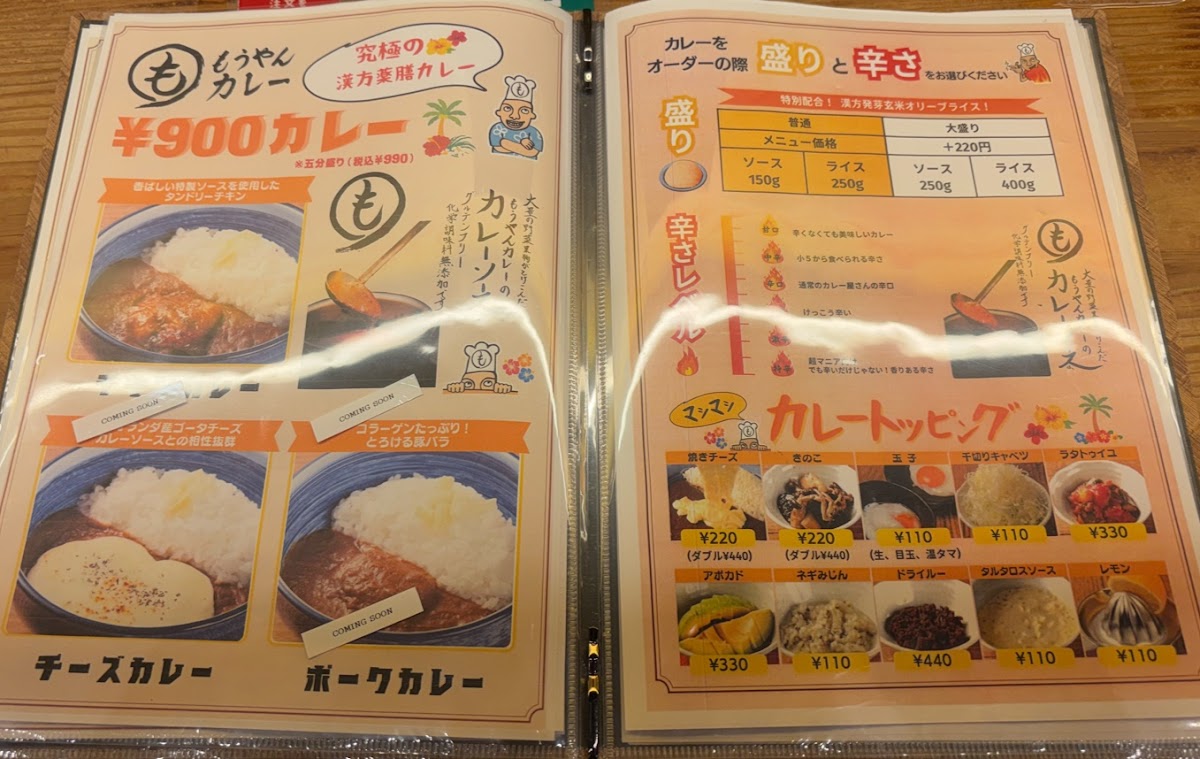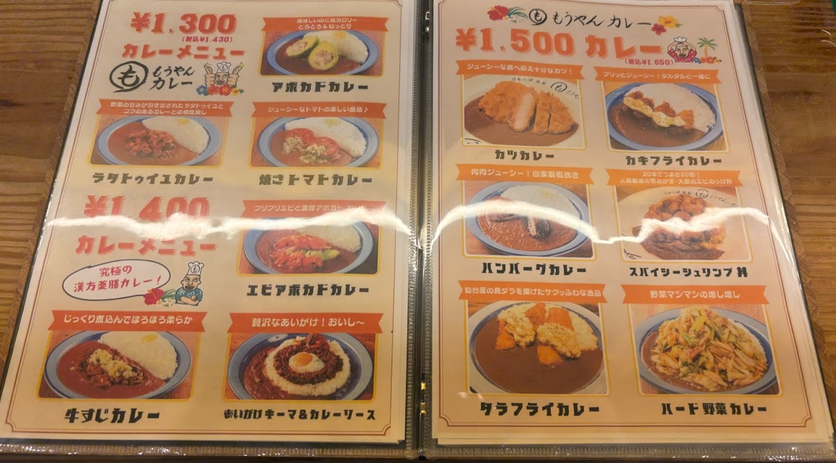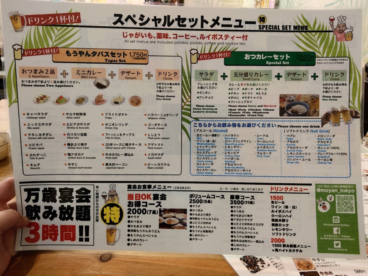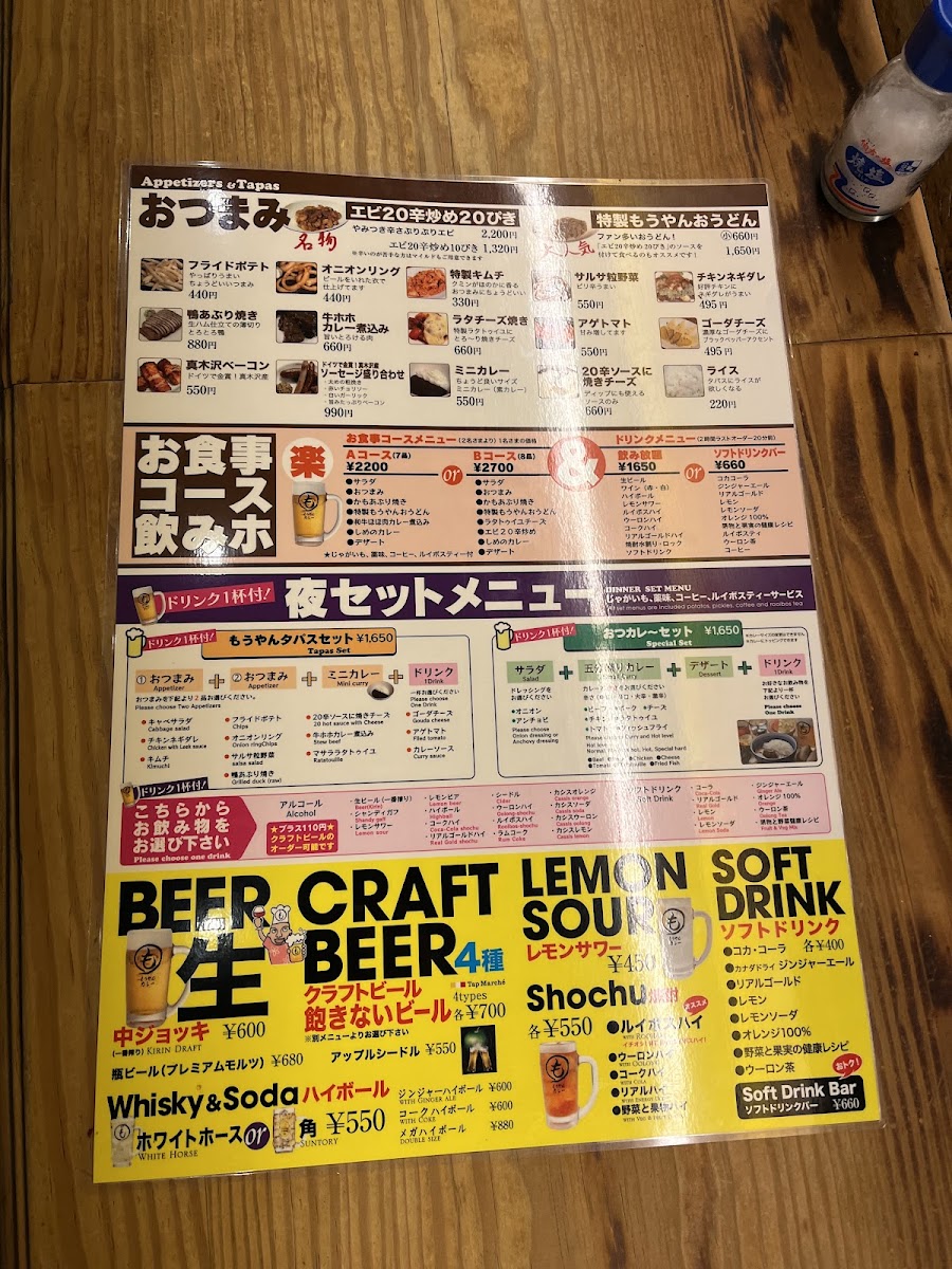 Moyan Curry offers a diverse and enticing menu that blends classic curry dishes with unique beverages and desserts. A standout on the menu is the カレーソース (Curry Sauce) for ¥100, which can be paired with various options like the ドライカレー (Dry Curry) for ¥50 or the bold にんにくビーフ (Garlic Beef) for ¥1 each. For a refreshing addition, you can enjoy a レモン (Lemon) slice for ¥1/2 cut. For those with a sweet tooth, the 抹茶アイス (Matcha Ice Cream) provides a perfect dessert choice, and the rich 宇宙一濃い抹茶アイス (Space’s Strongest Matcha Ice Cream) offers an intriguing treat. The drinks menu is equally varied, offering choices like スパークリングワイン (Sparkling Wine), アップルシードル (Apple Cider), and refreshing beers such as the 中ジョッキ (Medium Glass of Beer) and Inedit (Special Beer). For beer lovers, there are delightful cocktails like シャンディーガフ (Shandy Gaff) and ビタCガフ (Vita C Gaff). If you prefer something stronger, the 角ハイボール (Kaku Highball) and various 焼酎 (Shochu) options, including ルイボスハイ (Rooibos High), are available. Non-alcoholic options such as ペプシ (Pepsi), デカビタC (Decavita C), and オレンジ100% (100% Orange Juice) are perfect for all tastes. The menu caters to every preference, combining savory, sweet, and refreshing drinks in a unique fusion.